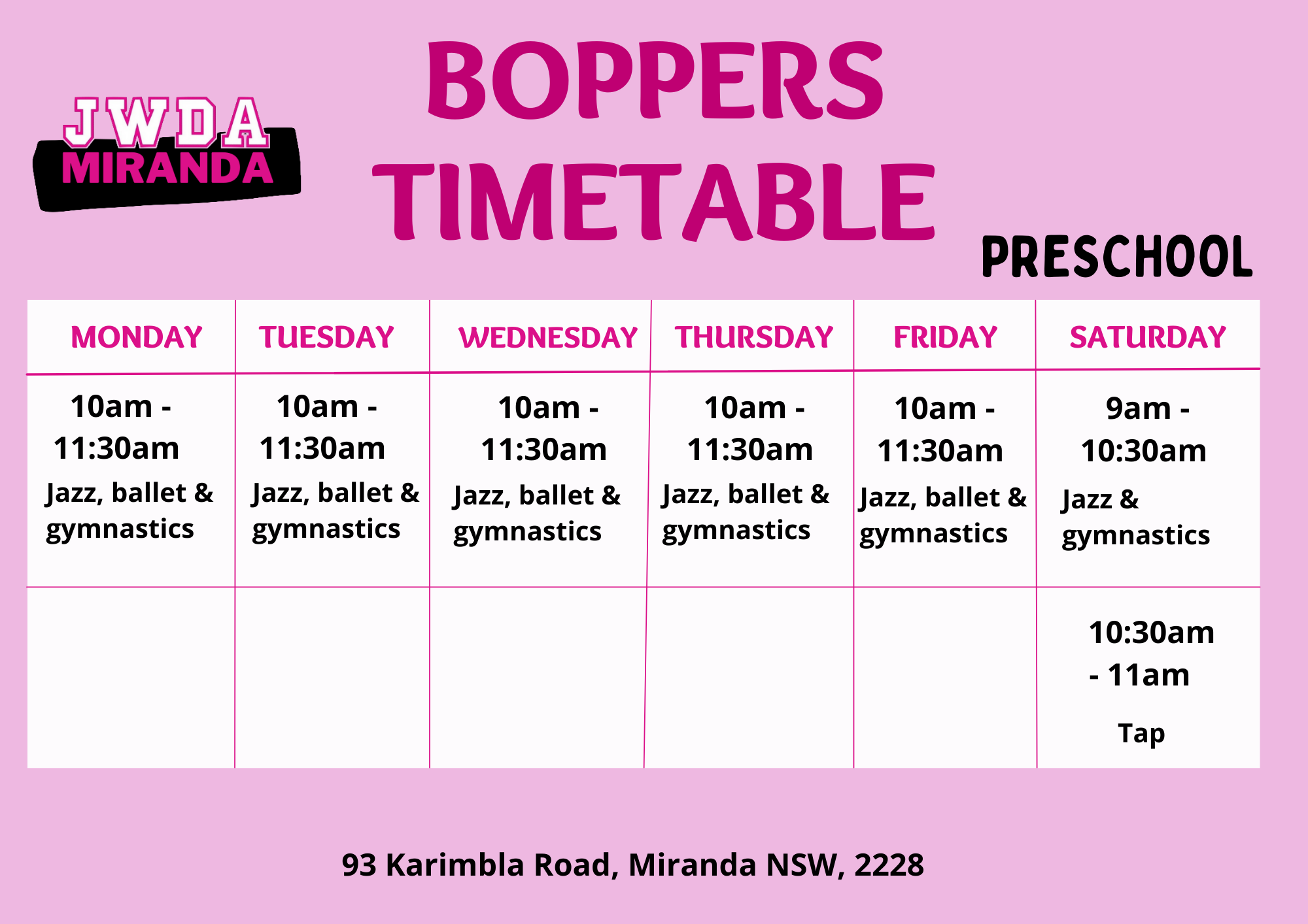 Combo Includes jazz, ballet and gymnastics Monday-Friday & Jazz, gymnastics and tap Saturday.